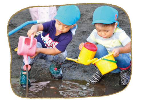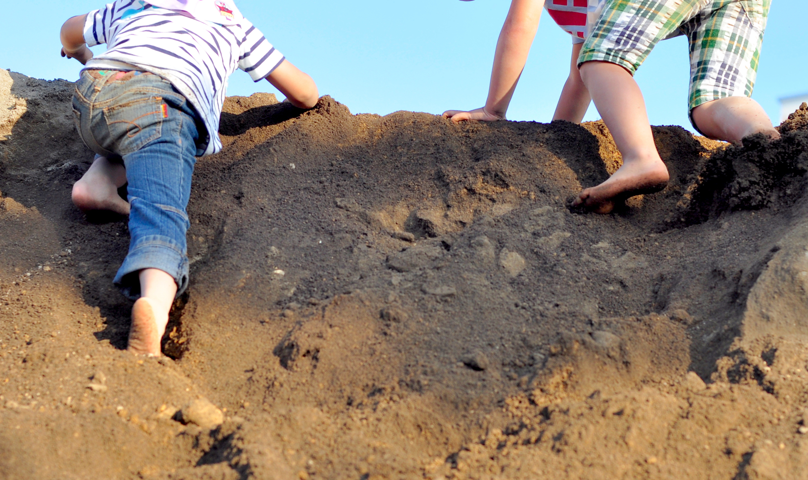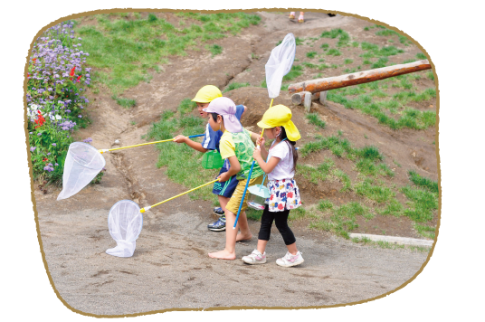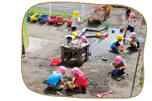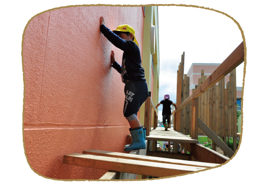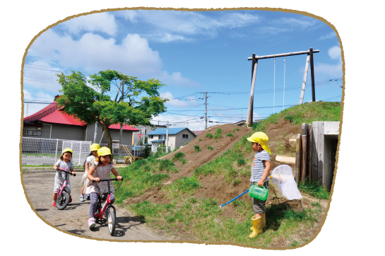 子どもたちがはだしで走りまわり、放課後には小学生もやってくる園庭には、地元の土で作った野性味あふれる築山や、段々畑のような砂場があります。園庭づくりはまだまだ続きます。職員や保護者、地域のみなさんや専門家、そして安平町の協力を得ながら、子どもたちが想像力をフル回転して遊べる環境づくりは、2017年から5カ年計画で進んでいます。地元の高校生が手作りした木製ステージや、地元小学生のアイデアを取り入れた水場作りにはじまり、ハイジのブランコや展望台などの新たな遊具も続々登場。“こころ・からだ・あたま”を育てる園庭を目指して試行錯誤しながら、遊びを通して子どもも大人も一緒に成長していきたいと思っています。